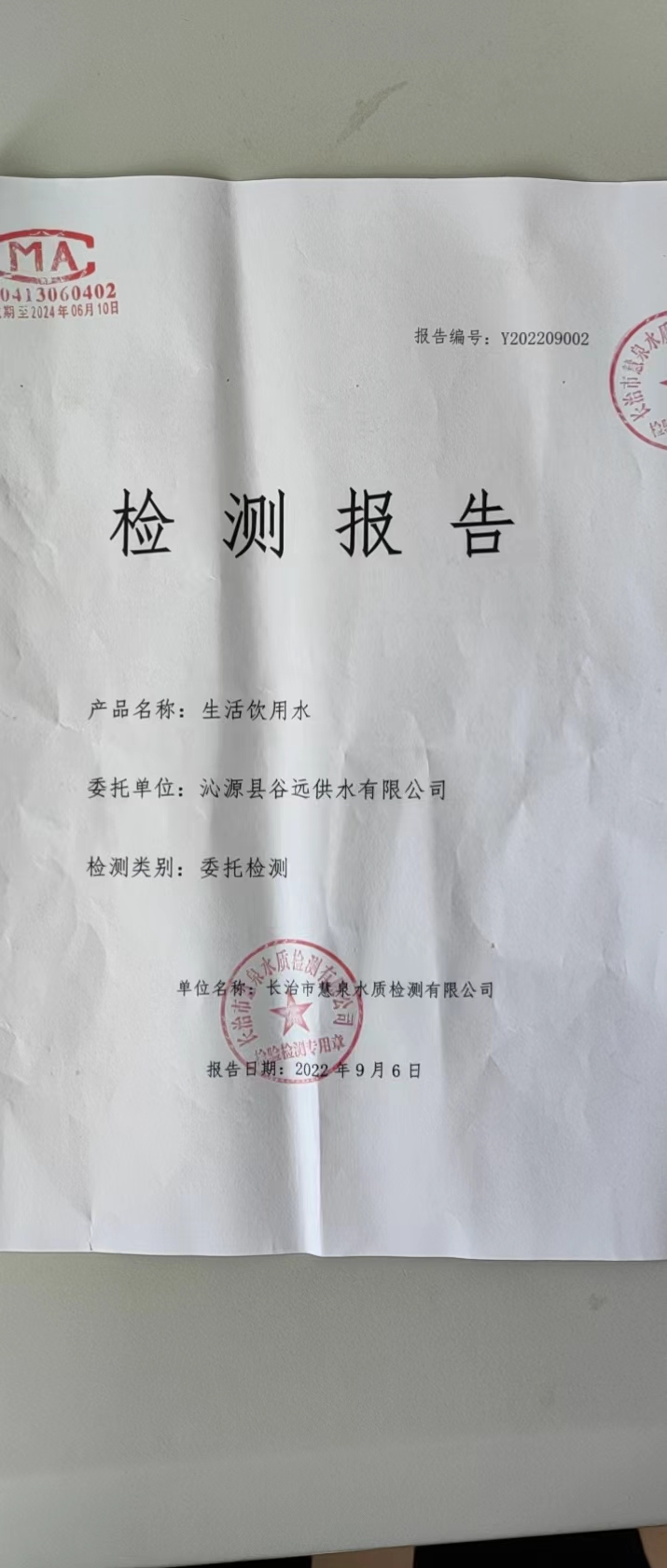 該檢驗報告由長治市慧泉水質檢測有限公司對沁源縣谷遠供水有限公司供水水質監督檢驗。
