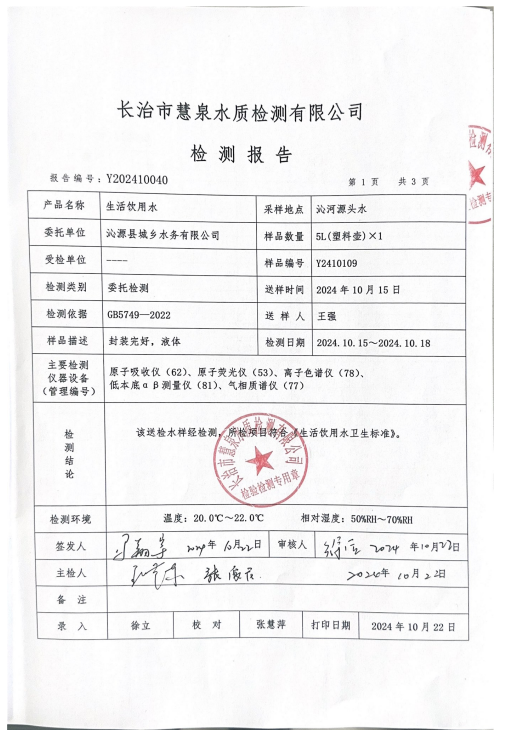 該檢驗報告由長治市慧泉水質檢測有限公司對沁源縣城鄉水務有限公司供水水質監督檢驗。